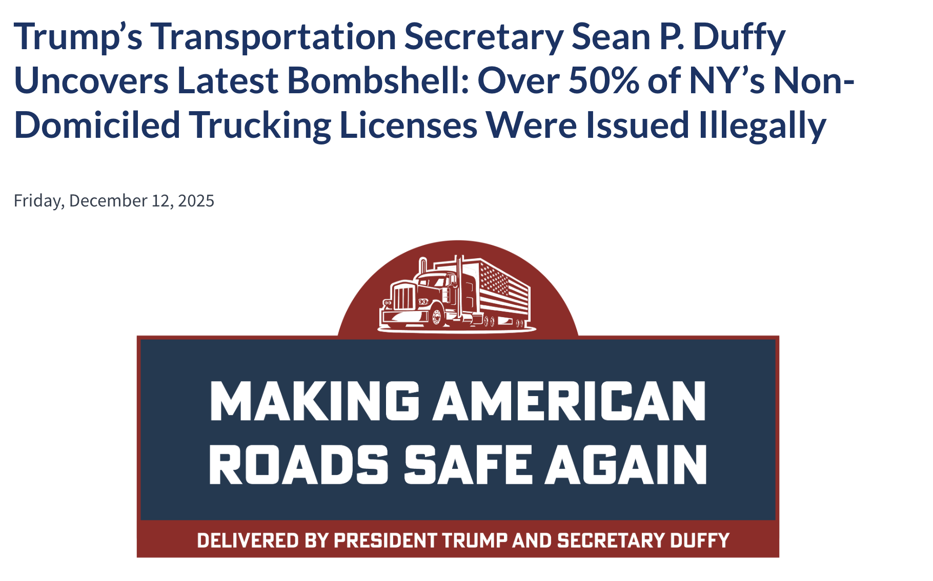 在美国交通部近期对全美各州非居民商业驾驶执照(CDL)发放的全国性审计中,纽约州成为最新焦点。交通部长肖恩·达菲周五在华盛顿特区召开新闻发布会,严词指出纽约州向外国移民发放商业驾照的流程存...