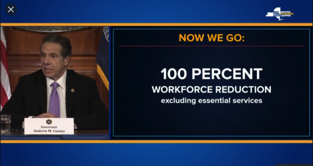 随着疫情的严峻,纽约州新冠死亡人数已达35例。葛谟也表示,从本周日开始,纽约州100%的劳动力必须呆在家里,只有必要的企业才能开放,如医院、超市、药店等。同时将采取民事罚款和强制关闭的措施将打击那些不遵守的企业。不过目前尚无针对个人的罚款计划。
