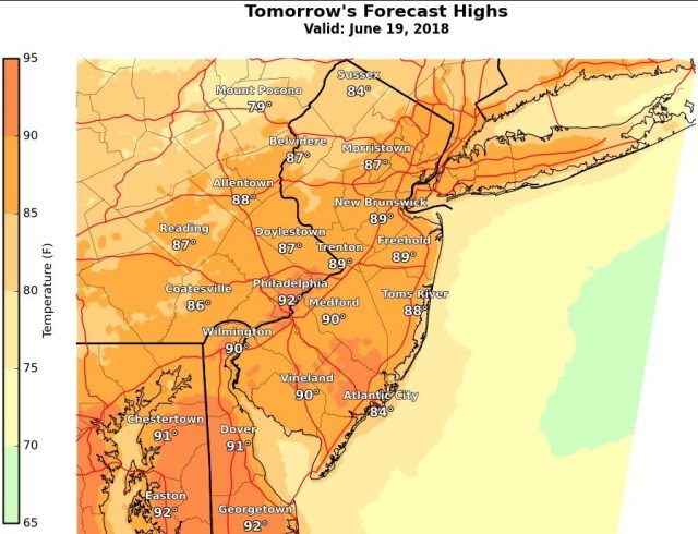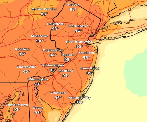 除了四个县(Atlantic, Cape May, Cumberland and Salem)之外的所有地区气温均在90度之上,直到晚上8点。 高温在东北五个县(Bergen, Essex, Hudson, Passaic and Union)的中午11点开始出现,随后还有12个县气温逐渐升高。 并发布高温空气质量警报。