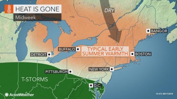 周三晚上和周四早些时候预计将出现降雨,高温酷热天气将有所缓解。
