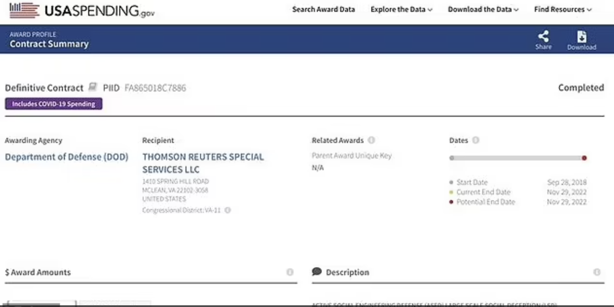 这一问题源于2018年由美国国防部(DOD)与汤姆森路透社特别服务有限责任公司(TRSS)签订的一项为期四年的合同。该合同的金额为900万美元,旨在开发工具来保护美国政府免受社会工程攻击。社会工程攻击是一种网络攻击方式,攻击者通过欺骗手段诱导目标泄露敏感信息。这项工作由国防部高级研究计划局(DARPA)提供资金,并由空军研究实验室授予。