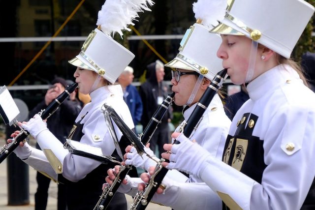 帕拉姆斯天主教军乐队的成员表演,笛声悠扬,在游行队伍中格外亮丽。