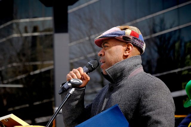 纽瓦克市长Ras Baraka在游行前向人群致辞。