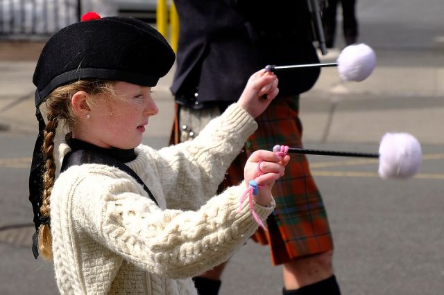 7岁的Casey Logue在用Kearny的St. Colmcille Pipe Band表演时转动鼓槌,动作娴熟,萌动现场。