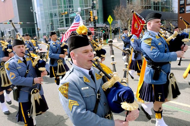 新泽西州警察管乐和鼓在游行队伍中。爱尔兰风笛笛声悠扬,鼓声阵阵。