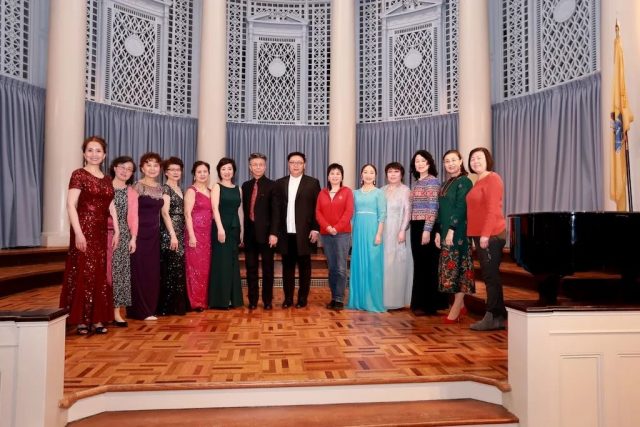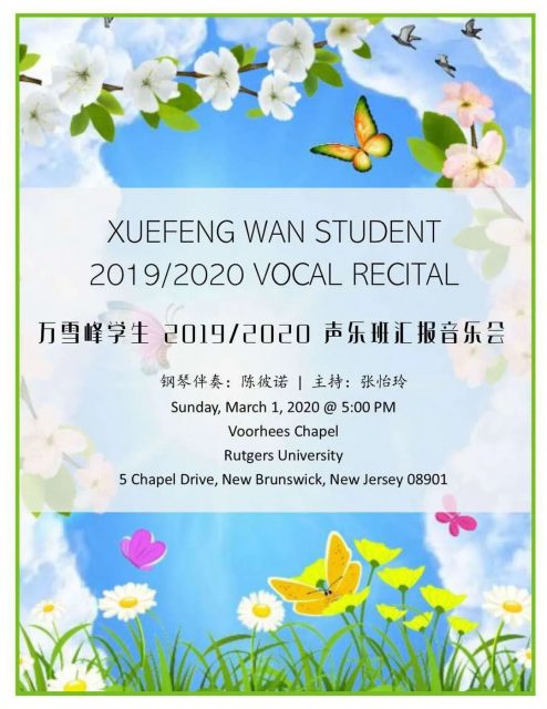 3月1日的傍晚,演员们纷纷来到Voorhees Chapel, Rutgers University,这座典雅隽永的小教堂,象牙白的罗马柱,浅蓝的垂幔,弧形的穹顶,这是一座多么美丽的小教堂啊!今晚它将属于万老师声乐班的学生们,它聆听着每一个跳动的音符,也见证着他们一步步的成长。