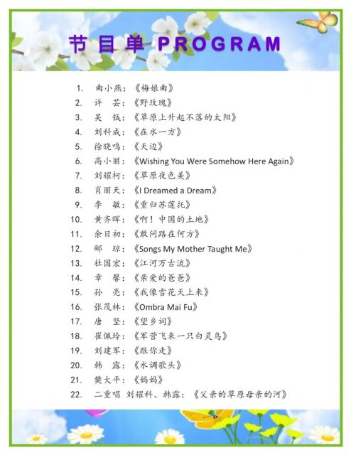 这次演出,就是声乐班的年度汇报演出,“麻雀虽小,五脏俱全”,老师和同学们倾注了巨大的心血,从设计节目单,服装到租场地,都力求完美,用万老师的话来说:学音乐最后就要到舞台上展示一番,大家在一起表演,本身就是一个相互观摩学习的过程。