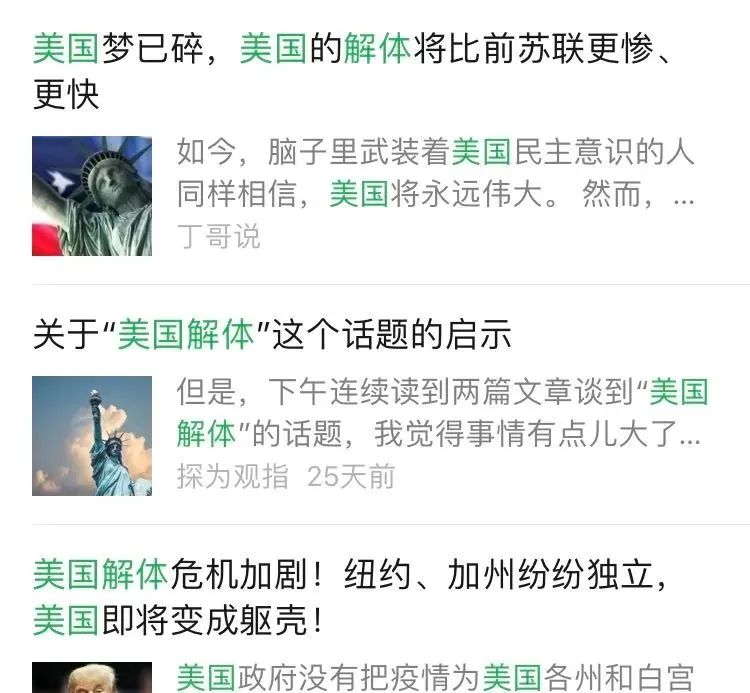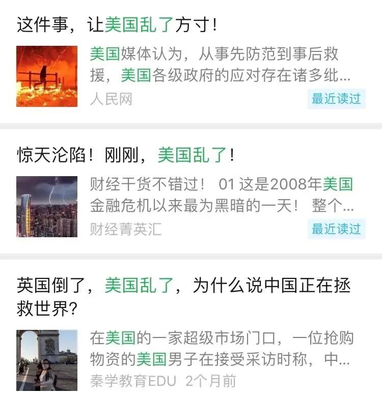 美国“沦陷”2次,“崩盘”3次,“溃败”3次,“顶不住”1次,“独立”2次,“被扯下遮羞布”1次,“被重创、被戳穿、衰退、危险、倒了、坠落”,各出现若干次.......