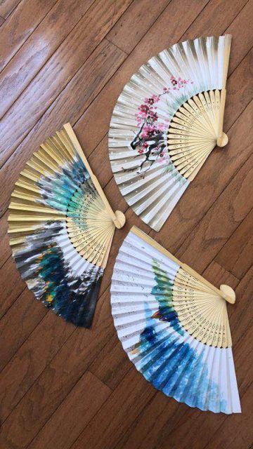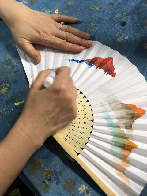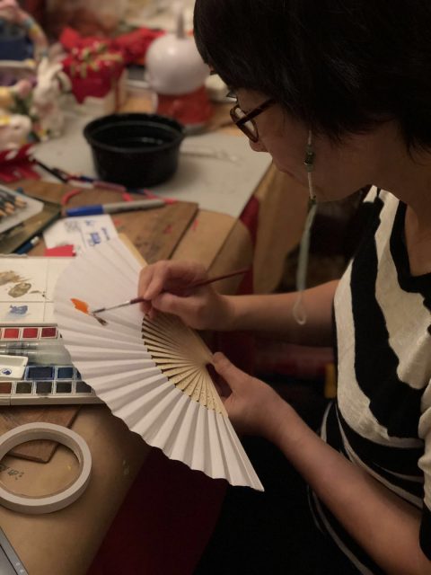 最为惊艳的是,现场有艺术家在折扇上作画。