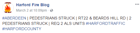 而对于质疑新闻真实性的朋友们,根据一个创立于2011年,第一时间播报Harford County(位于马里兰巴尔的摩附近)突发的新闻事故Facebook页面,可以找到当天发生事故的记录: