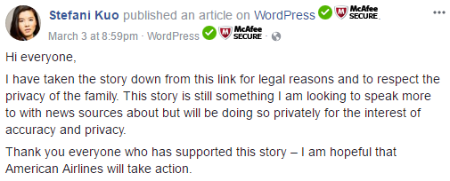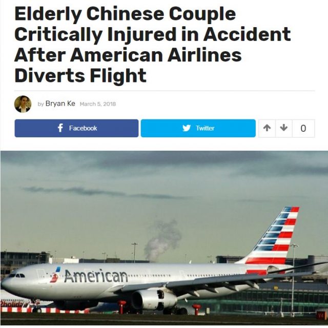 原作者Stefani是我的朋友,她上周在乘坐Amerian Airlines的飞机时遇到了一对因为航空公司一系列不负责任的行为而险些丧命的中国夫妇。她把经历详细地写在了她的脸书上。在商议过后,我们决定由我翻译,把这篇文章发在中国的社交网络上,以此增加影响力,给航空公司施压。