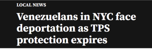 根据《纽约时报》获得的政府文件显示,特朗普政府已撤销超过30万名在美委内瑞拉人的临时保护身份(Temporary Protected Status,简称TPS),这使得他们在未来几个月内可能面临被驱逐出境的风险。纽约市的委内瑞拉人是居住在纽约市移民收容所的最大移民群体。