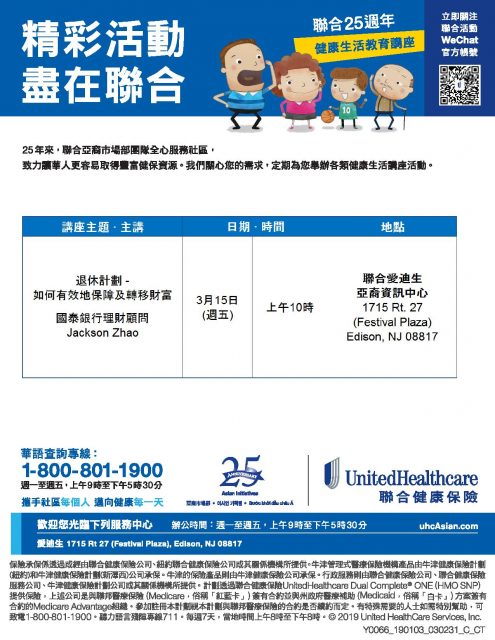联合健保爱迪生亚裔资讯中心将于3月15日(周五)早上10时举办「如何有效地保障及转移财富」讲座,邀请了国泰银行理财顾问Jackson Zhao先生与民众一起探讨退休计划,如何有效利用长期护理保险、财产转移及其他理财知识,使财富得以保存。若想瞭解更多,请即致电华语专线预留座位,讲座地点: 联合健保爱迪生亚裔资讯中心1715 Route 27 (Festival Plaza), Edison, NJ 08817。