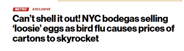 据《纽约邮报》获悉,由于禽流感疫情造成鸡蛋短缺,盒装蛋价格飞涨。