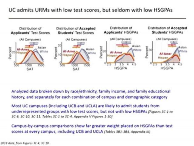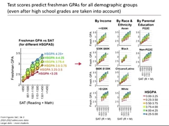 数据最详实,最令人信服的发言是加州大学标准考试专题研究小组的Andrea Hasenstaub副教授(录像第1:55-2:04时段) 。她使用加州大学的统计分析,证明了以下十分重要的结论: