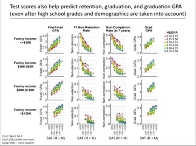 第二、标准考试是唯一能够预测学生入学后能否完成学业、取得满意的学习成绩的指标。在各个经济收入基层都有效(见下图)。它对学生是否会中途退学的预测的相关性比中学GPA高五倍之多。