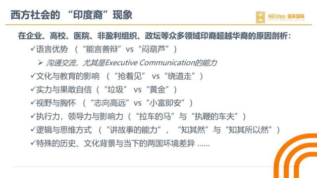 丁老师表示, 他在IBM做咨询业务时接触了很多行业, 以他个人过去二十年的亲身体会, 包括在IBM领导包括印度籍员工在内的400多名员工的经历,感受到印度裔不仅仅是在500强企业体现出强大的竞争力,从政坛到高校,目之所及都能看到印裔发展越来越成功;而华人圈子里近年来颇有些对印裔的不满和抱怨, 但往往忽视了别人的优点和我们自身的局限。这些都是值得我们深思的。