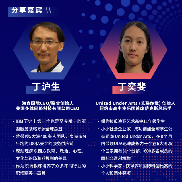 印州美中商会、海育国际联合主办,印城华夏文化中心协办的第八期海育战疫系列公益讲座紧紧围绕如何打破华裔发展天花板这个主题,由海育国际CEO/联合创始人、高管教练丁沪生老师和United Under Arts (艺联你我) 创始人丁奕斐结合自己多年来在美国学习、工作、生活的经历和切身体会,为大家分享了平时难得听到的干货和实用技巧。