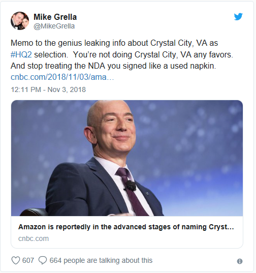 虽然美国大多数民众还在热聊着中期选举的话题,但是对于纽约州和弗吉尼亚州的居民来说,亚马逊给他们带来的要更加实惠。华盛顿邮报最近透露了亚马逊高层会议谈论最多的地方是水晶城(the Crystal City),引爆了亚马逊高层的不满,推文否认。