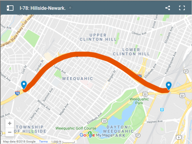 每天高达152,721辆汽车使用I-78位于Hillside的Winans Avenue和纽瓦克的Northeast Corridor铁路线之间的路段。这是往返于泽西中部郊区的上班族频繁使用的路线。这也是通往 Holland Tunnel 的主要路线。
