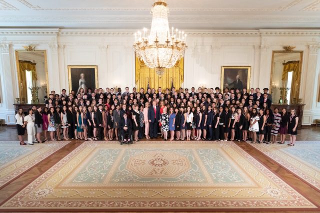 2018年总统学者奖共颁发给161名高中生,其中华裔28名(约17%),包括4人获艺术类奖项。图为2018 获总统学者奖的高中生与川普总统合影