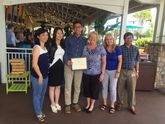 赵睿达(左三)和其父(赵宇空,右一),其母(李文兰,左二)和高中校长(Dr. Anne Carcara, 右三)和物理老师(Sue Fen Huang 左一),生物老师(Melissa Juergen, 右二)于2016年春的合影