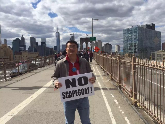 欧阳了寒在纽约布鲁克林大桥上抗议梁警官案审判不公