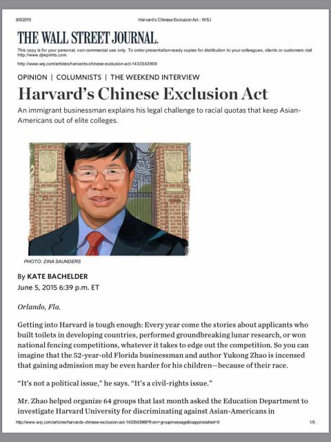 • 2015年6月5日,美国排名居首,日发行量达两百万份的《华尔街日报》刊登了对赵宇空先生的采访。这是美国媒体首次对亚裔教育主题最全面、最深入的采访。