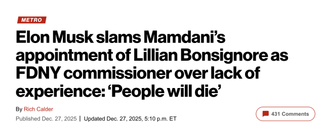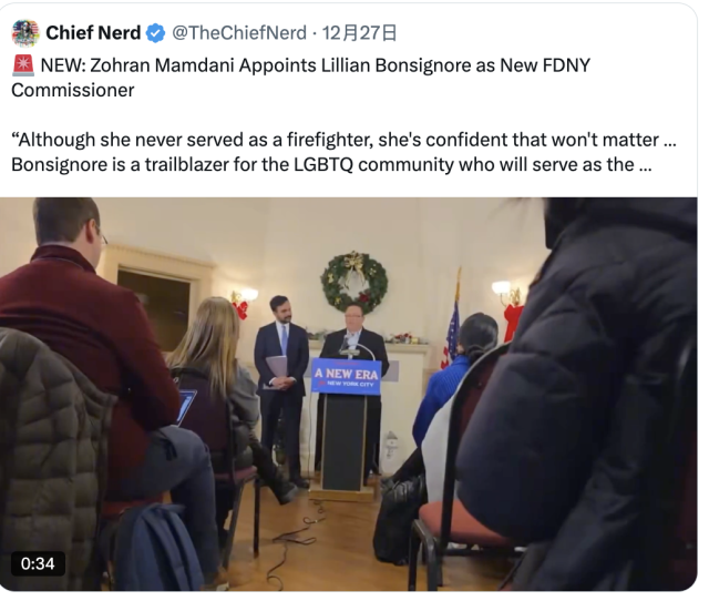 埃隆·马斯克近日将矛头直指纽约市当选市长佐兰·曼达尼(Zohran Mamdani)的一项关键人事任命——任命拥有31年急救服务(EMS)背景的莉莲·邦西诺尔(Lillian Bonsignore)为纽约市消防局(FDNY)下一任局长。马斯克警告称,这一决定可能带来“致命后果”。