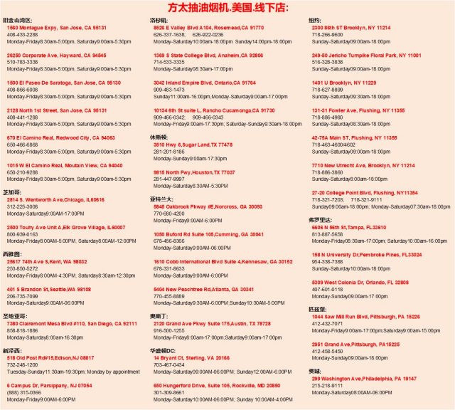 线下门店信息:http://www.fotileglobal.com/us/service/zhan_ting