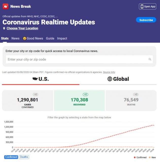 据News Break报道,根据WHO、NHC、CCDC、ECDC等官方数据,截止美国东部时间5月8日凌晨4:54,美国新冠昨日单日新增死亡病例1965例,累计确诊1290801例,死亡76549例,康复170308例。