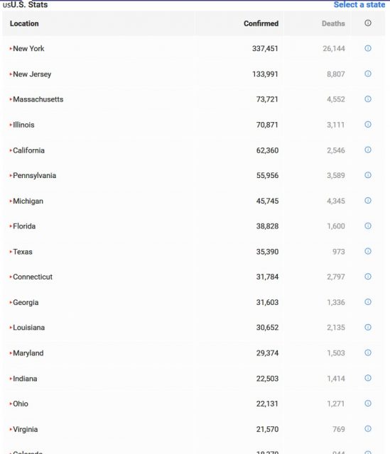 其中纽约州累计确诊337451例,死亡26144例;新泽西州累计确诊病例133991例,死亡8807例;康涅狄格州累计确诊病例31784例,死亡2797例;宾夕法尼亚州累计确诊病例55956例,死亡3589例。