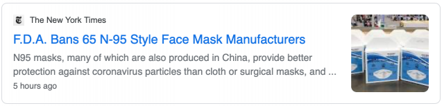 N95口罩比布面罩或外科口罩能更好地防止新冠病毒颗粒,在医疗保健提供者和急救人员中需求极高。4月3日,N95口罩的严重短缺导致FDA允许从中国进口类似口罩。