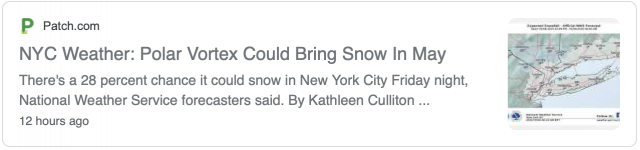 极地涡旋周末来袭纽约 或出现罕见5月降雪