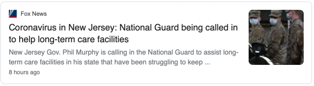 据侨报纽约网报道,新泽西州州长墨菲(Phil Murphy)5月7日周四宣布,新州国民警卫队(National Guard)本周末将派遣120多名士兵前往长期护理机构。