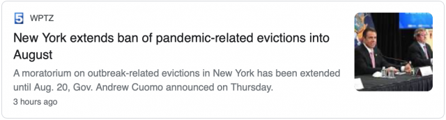 5. 3月20日起所有租户都受到州驱逐禁令的保护,此前该禁令持续至6月。库默在今天的记者会上宣布将驱逐禁令延长至8月20日。并且禁止房东向错过付款期的房客索要过时附加费,并允许使用押金交房租。库默表示,他也理解房东的压力,会继续和银行商议救济事宜,但目前一切以救人为先。