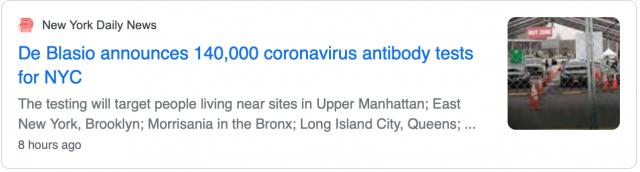2. 除了在本周早些时间宣布的将为14万医护工作者提供抗体测试,市府也将与BioReference实验室合作从下周开始为14万纽约市居民提供免费抗体测试。在纽约市设立5个检测点,分别在:Morrisania, East New York, Upper Manhattan, Concord, Long Island City。白思豪表示,预计日检测量达到5000人,在一开始的两周内达到目前7万人。检测结果将在24-48小时内得到。