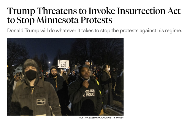 在抗议持续之际,特朗普公开威胁启用《叛乱法》(Insurrection Act),不排除派遣军队进入明尼苏达州。“如果腐败政客不阻止职业煽动者攻击ICE的爱国者,我将迅速结束这场闹剧。”他在Truth Social上写道。