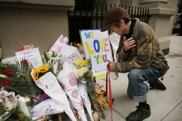 两个无辜的孩子被杀害,建筑物前堆满了人们留下的鲜花。
