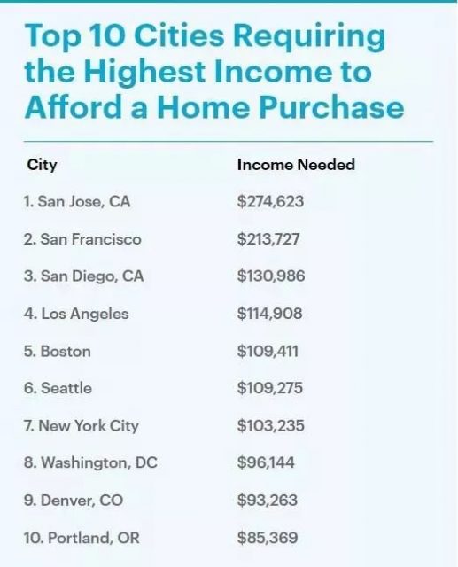 根据HSH.com编制的数据,圣何塞名列榜首,居民需要每年赚274,623美元才能买房,其次是旧金山(213,727美元),圣地亚哥(130,986美元)和洛杉矶(114,908美元)。