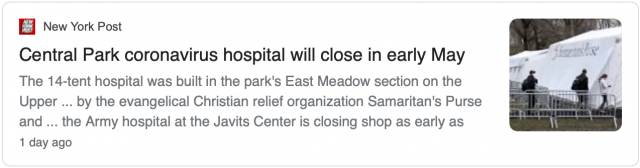 据《纽约邮报》报道,由福音派基督教救援组织撒马利亚人基金会(Samaritan \'s Purse)在位于上东区的公园东草坪区(East Meadow section)搭建了一家拥有14个帐篷的医院,旨在缓解西奈山医院的人满为患的状况。