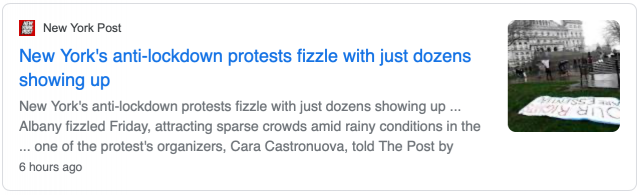 据《纽约邮报》报道,大约有100名示威者在稀稀拉拉的雨中来到州府大楼前抗议示威、之后游行到了州长府邸前,两处只有几个街区的距离。他们要求政府取消居家令这一减缓新冠病毒传播至关重要的行政命令。