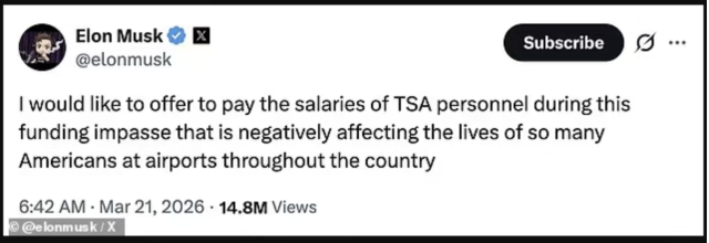 就在混乱持续之际,全球首富Elon Musk在社交平台X上发声,提出愿意为TSA员工支付工资,以缓解危机。
