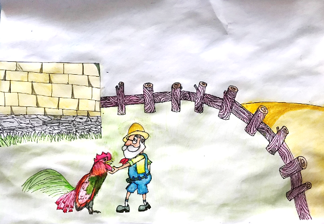 A long time ago in a village, lived a farmer and his big rooster. It was a beautiful rooster with a bright red cockscomb, a shiny neck and a colorful tail. The rooster was very diligent. Every day before dawn, he would jump onto the dirt wall by the court yard, flapping his wings, stretching his neck and singing loudly. After singing, he would take a break and then sing again. The rooster was very proud of his loud voice.