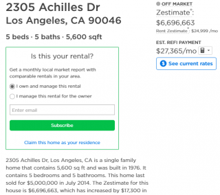 据崔永元爆料的信息,冯小刚在洛杉矶的地址是2305 Achilles Dr Los Angeles, CA。在Zillow网站上可以查到2014年7月份最后一次交易价格为500万美元。从白页(whitepages)网上的搜索同样显示,Feng xiaogang 居住在上述地址。