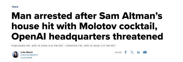上周五4月10日凌晨,一起针对OpenAI高层的暴力事件在San Francisco接连发生——公司首席执行官Sam Altman的住所遭人投掷燃烧装置,随后同一嫌疑人又出现在公司总部外,威胁纵火,最终被警方当场拘留。
