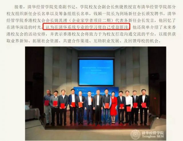 官方信息显示,姚其湧不仅是清华经管学院香港校友会会长,同时还是经管学院企业家学者项目二期学员。