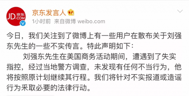 刘强东先生在美国商务活动期间,遭遇到了失实指控,经过当地警方调查,未发现有任何不当行为,他将按照原计划继续其行程。我们将针对不实报道或造谣行为釆取必要的法律行动。