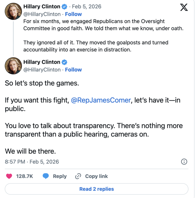 这场博弈在一周内急转直下。周一,克林顿夫妇同意配合调查,以避免因拒绝作证而遭遇“藐视国会”的投票;周五,希拉里却在X平台上公开炮轰监督委员会主席、肯塔基州共和党人詹姆斯·科默,指责其“不断改变规则”,把问责变成政治转移。“六个月来,我们本着诚意与委员会沟通,在宣誓后如实说明了所知的一切。别再玩这些把戏了,”她写道,并点名科默挑战道,“你不是总谈透明度吗?那就公开来——摄像机全程开着,我们会到场。”