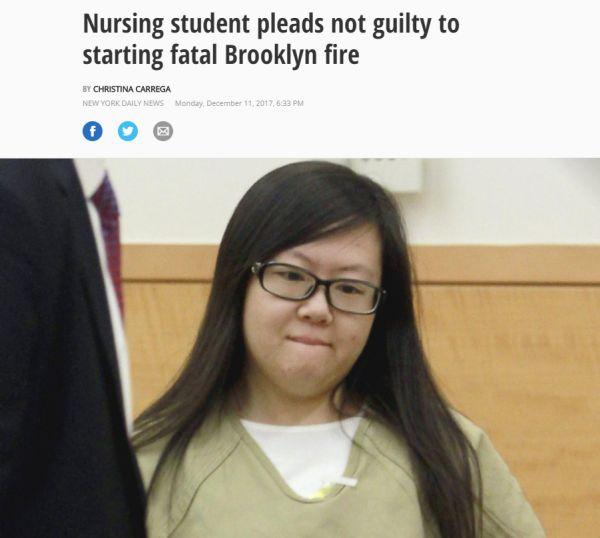 12月11日(星期一),住在纽约布鲁克林戴克高地的一名22岁华裔女子因涉嫌纵火和谋杀罪被起诉, 该名女子上个月在她居住的公寓楼里燃火,最后导致了两个邻居在大火中丧生。但是这名女子在周一上庭时拒不认罪,根据庭审记录,她称自己通常都习惯性地点燃垃圾然后丢进垃圾桶让它自己燃烧。
